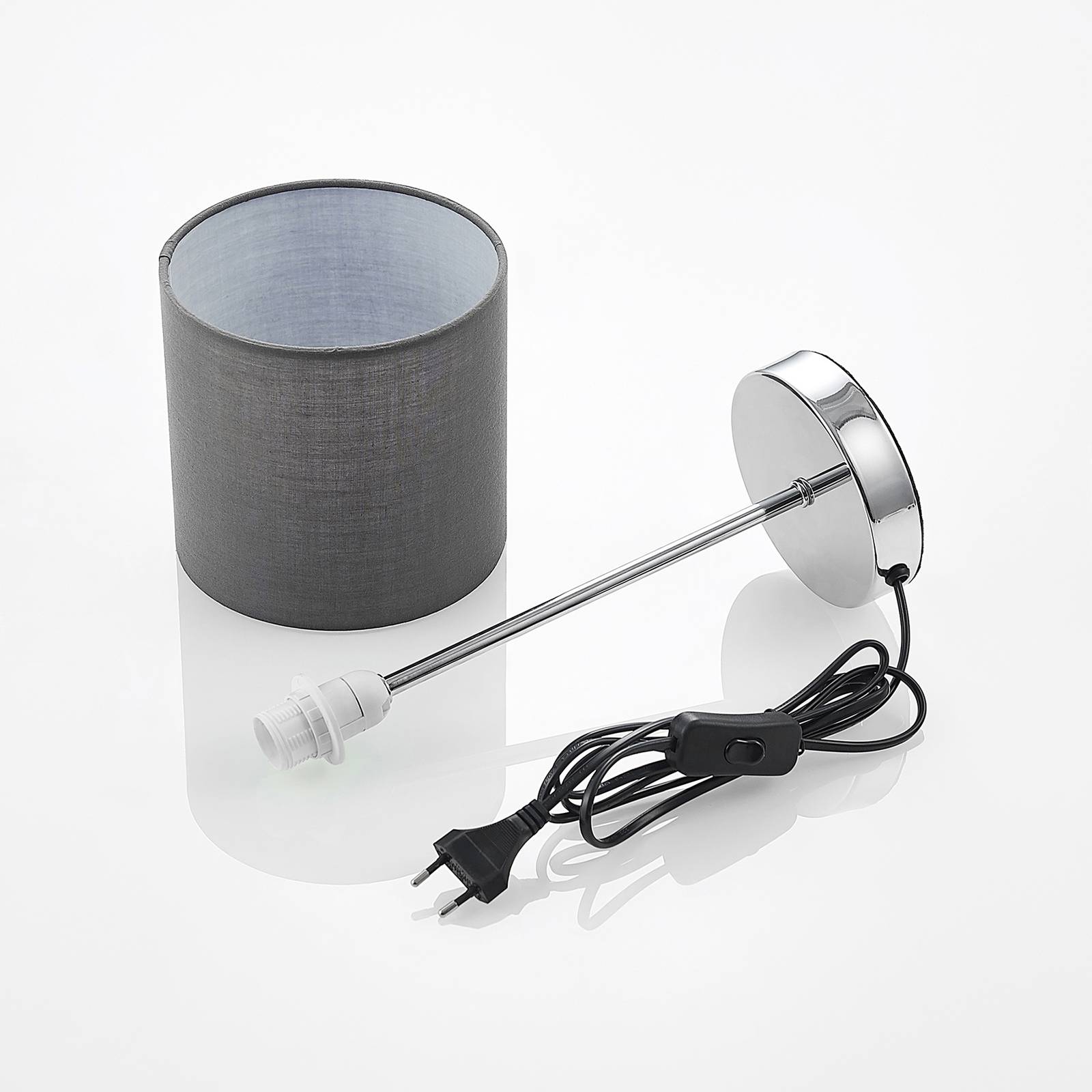 Bellezza classica - lampada da tavolo Leokadia Per una bella illuminazione supplementare o anche come luce notturna decorativa serve la lampada da tavolo Leokadia. È costituito da un telaio cromato, sul quale è intronizzato un paralume di forma classica. Questo è tenuto in un sottile colore grigio e si adatta perfettamente al moderno, così come molti altri stili di vita. La lampada da tavolo può essere posizionata su cassettiere, tavolini, sul letto come comodino o decorativa nella finestra. Un piccolo interruttore on / off sul cavo assicura una comoda commutazione.