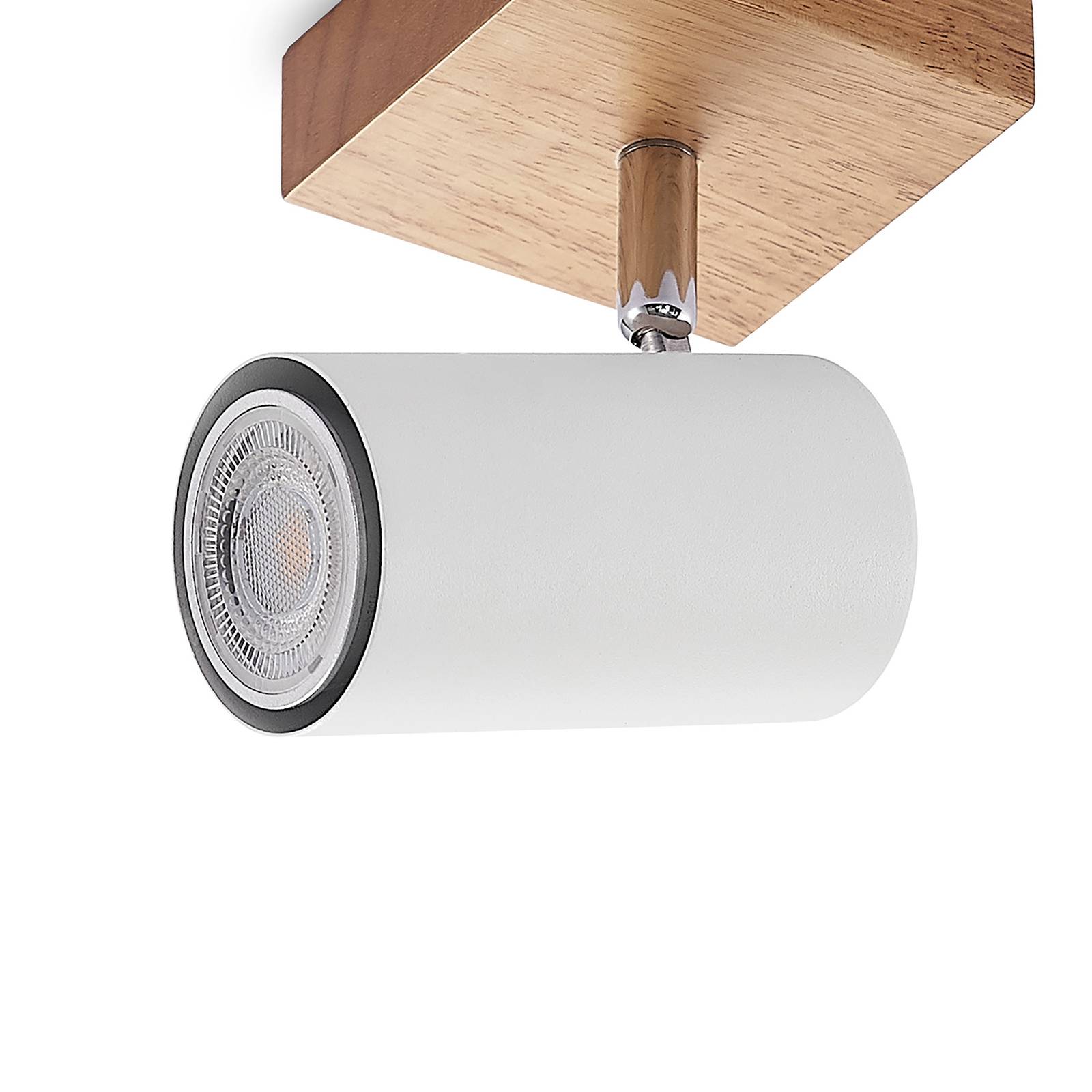 Semplice faretto Maniva in ferro e legno di gomma Maniva è un bellissimo faretto che ha un design solido che è sia sottile che moderno. La piastra di montaggio è in legno di gomma, mentre il paralume è in ferro. Il paralume bianco ha una forma cilindrica e quindi emette la luce in modo mirato, in modo che alcune aree della stanza o oggetti possano essere ben illuminati. Questa lampada può essere utilizzata in un soggiorno così come nel corridoio o nelle scale.