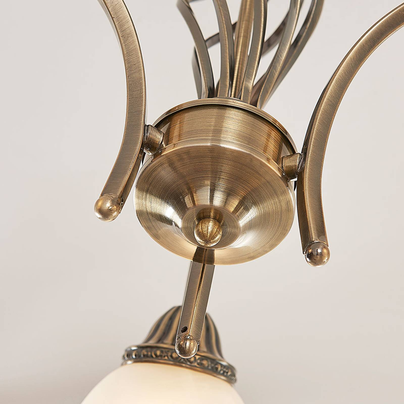 Lampada da soffitto Mialina con struttura color ottone antico Mialina è una meravigliosa lampada in stile classico, curata fin nel minimo dettaglio. I diffusori, realizzati in vetro con effetto alabastro, hanno la forma di una campana che si allarga alla base. La struttura con superficie verniciata in colore ottone antico fa sembrare la lampada un oggetto antico. Sopra i bracci curvi di metallo si sviluppa un elemento ritorto, che rende la lampada un pezzo unico e inconfondibile.