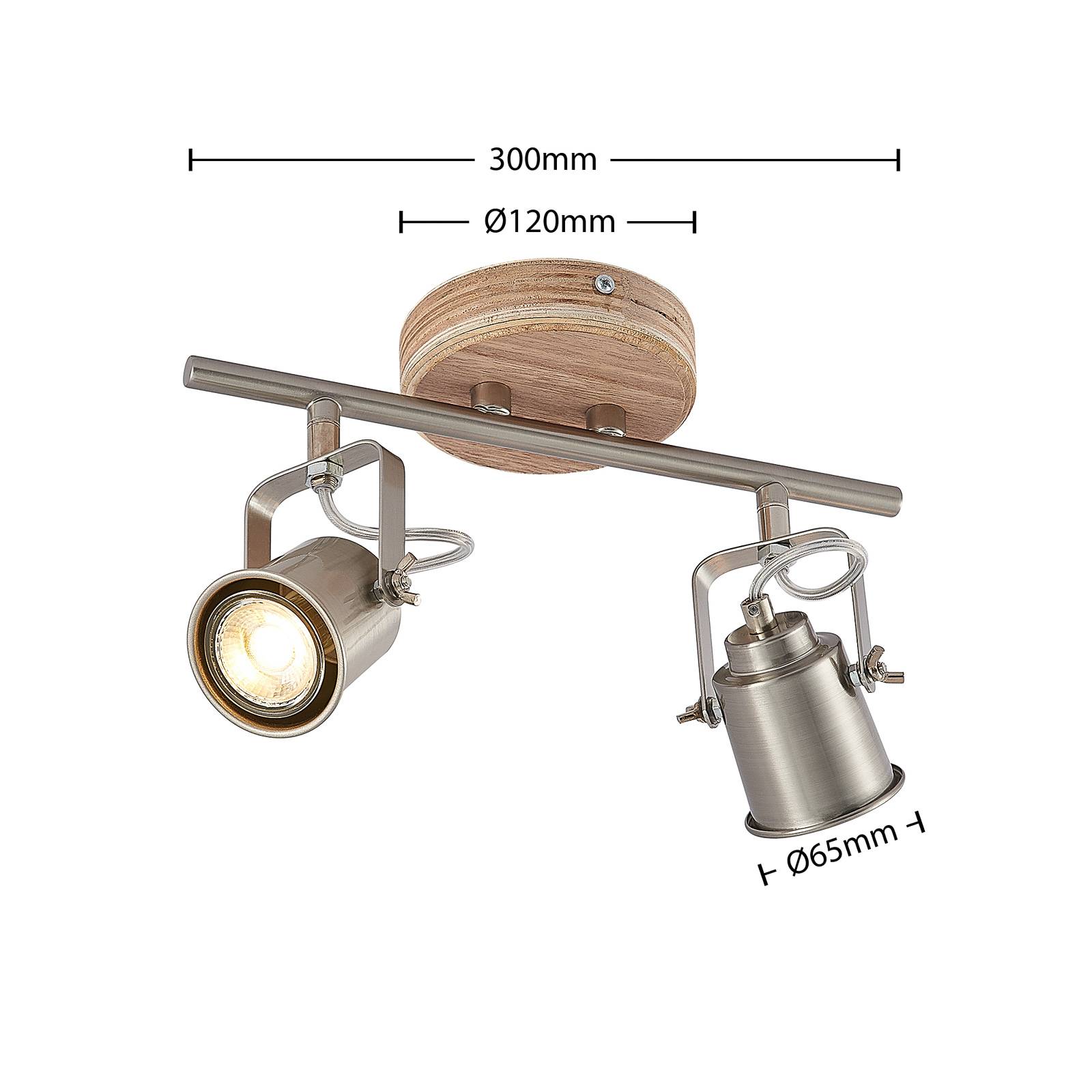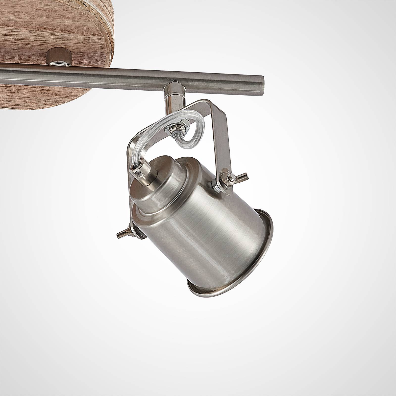 Faretto a soffitto flessibile Mikadi due paralumi Il faretto da soffitto Mikadi ha quel qualcosa che attira tutti gli occhi. Questa bella lampada combina elementi in legno e metallo in un design elegante che ricorda il look vintage. Grazie a due morsetti a vite ciascuno, le tonalità possono essere cambiate nella loro posizione a seconda delle esigenze, in quanto possono essere sia inclinate che ruotate. Le lampade GU10 appropriate per questo faretto possono essere ordinate separatamente tramite gli accessori, lasciando all'utente la scelta dell'angolo di apertura del fascio e della temperatura di colore.
