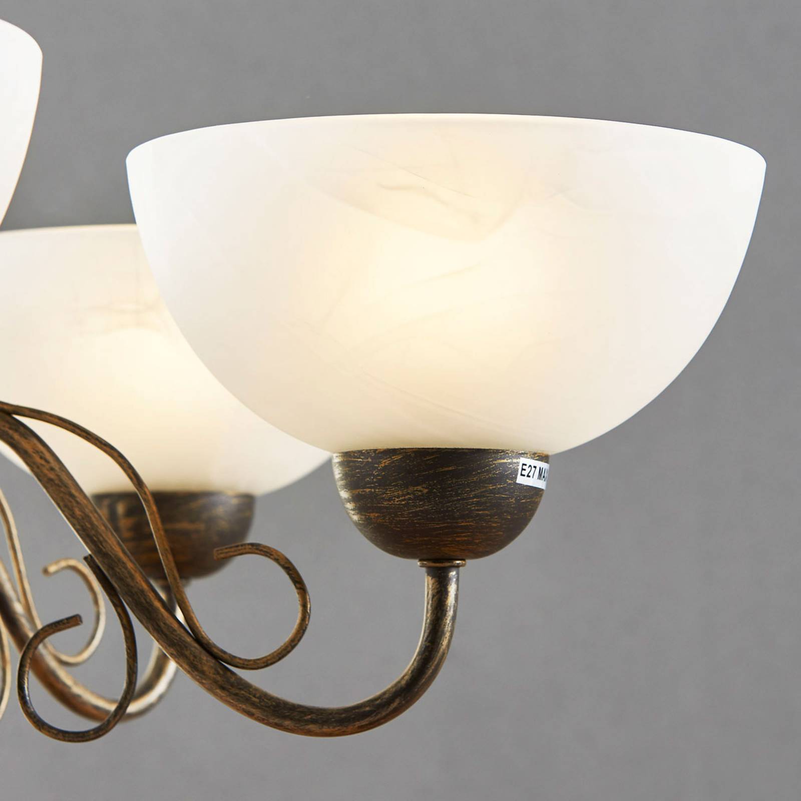 Lampada a sospensione per sala da pranzo Mohija con cinque diffusori aperti in alto in vetro con effetto alabastro Mohija produce una luce calda e invitante, che rende ogni cena un'occasione speciale e ricca di stile. La luce di Mohija ci fa sentire bene e ci fa apprezzare non soltanto il cibo, ma anche la compagnia, lo scambio di idee in famiglia e la conversazione tra amici. I cinque diffusori garantiscono un'illuminazione intensa, ma nello stesso tempo calda e avvolgente. La struttura della lampada a sospensione per tavola da pranzo è una vera opera d'arte, con le staffe di metallo dalla forma sinuosa e gli elemento decorativi a viticcio.