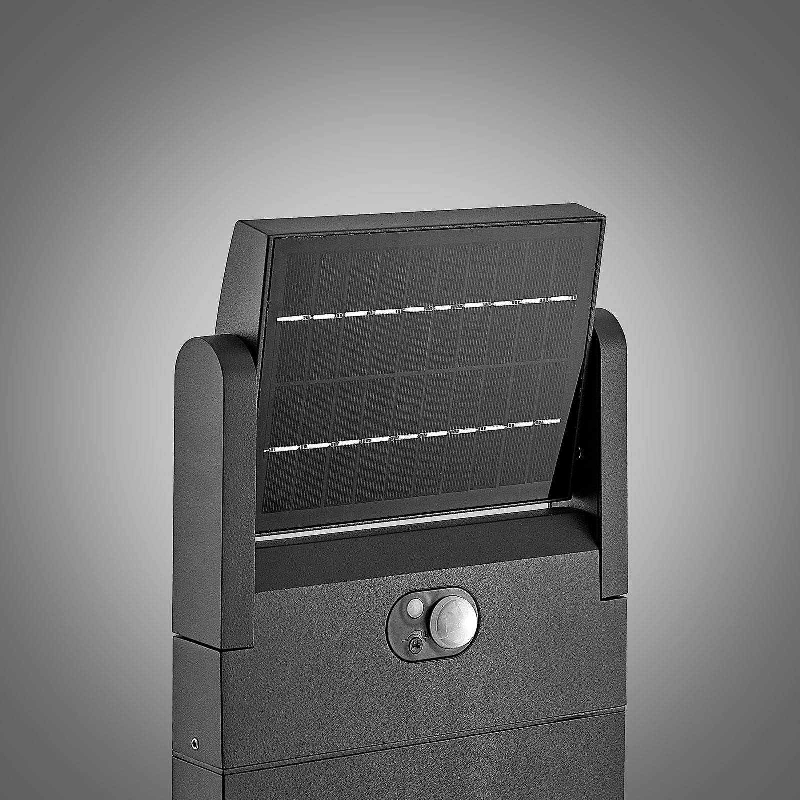 Luce a LED del percorso solare Novalie in grigio scuro La luce solare direzionale Novalie LED combina un'elegante illuminazione esterna con una varietà di caratteristiche tecniche. È realizzato in alluminio e ha una finitura grigio scuro. La sua testa della lampada è praticamente regolabile, in modo che sia possibile un'illuminazione variata. Grazie al suo grado di protezione IP54, la luce a LED per il percorso solare Novalie è protetta dalla polvere e dagli spruzzi d'acqua, quindi può essere installata nel vialetto senza problemi. È dotato di un interruttore che permette di impostarlo su tre diverse modalità: modalità luce notturna, modalità normale e modalità luce costante. -testa dell'apparecchio regolabile 340 -Angolo del sensore di movimento 100 -zona di rilevamento 5 - 7 m -Classe di protezione IP 54