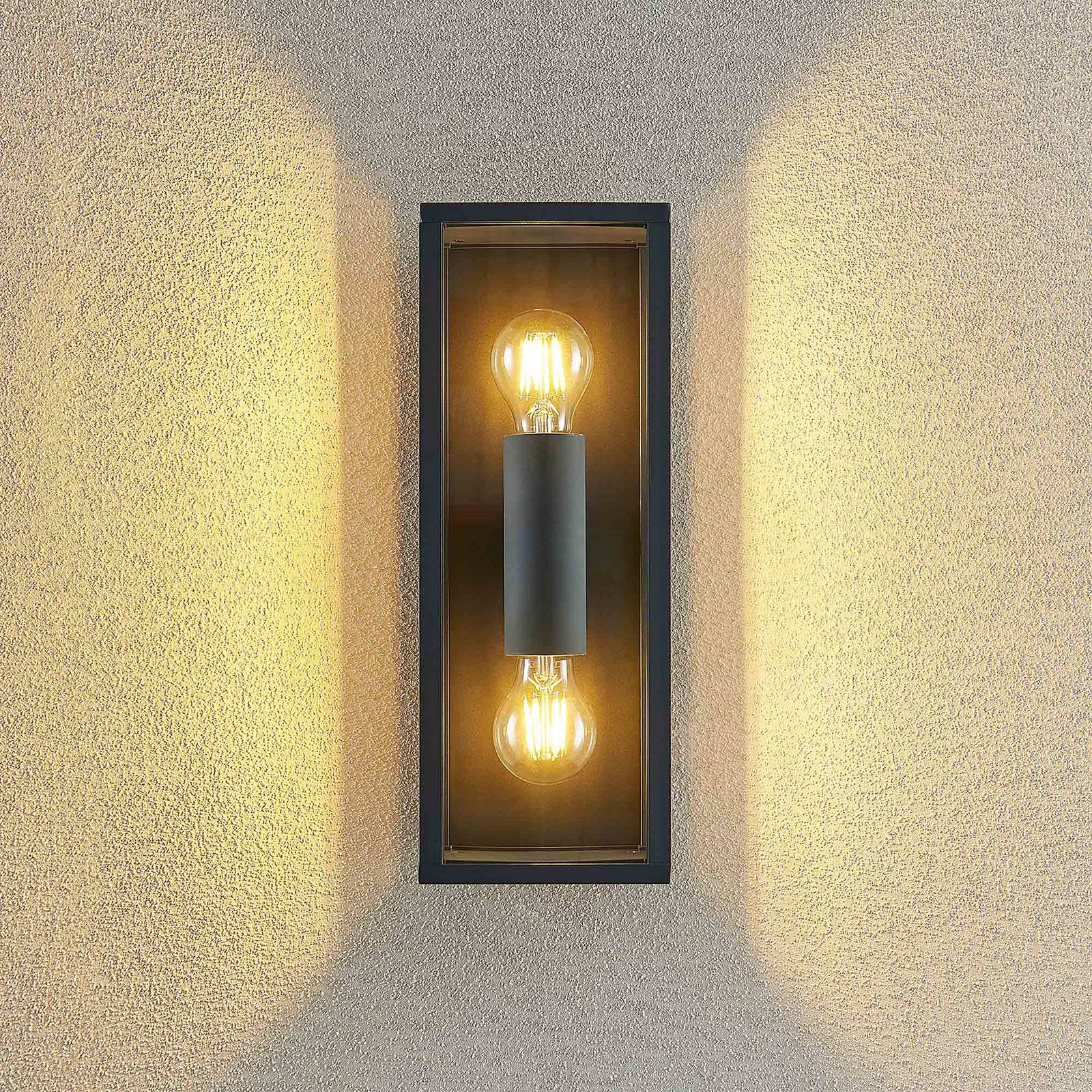 Lampada da parete scura per esterni con due prese E27 La lampada da parete per esterni Peldar colpisce per il suo particolare design. L'alloggiamento è in alluminio e ha un design grigio scuro, in modo che si distingua visivamente bene dall'ambiente circostante. Il paralume è in vetro, in modo che le due fonti di luce possano essere viste da tutti i lati. Le prese sono dirette verso l'alto e verso il basso, il che dà alla lampada un carattere interessante. L'utente può scegliere le lampadine da utilizzare come desiderato, ma si raccomandano le lampade decorative, che sottolineano l'aspetto della lampada.