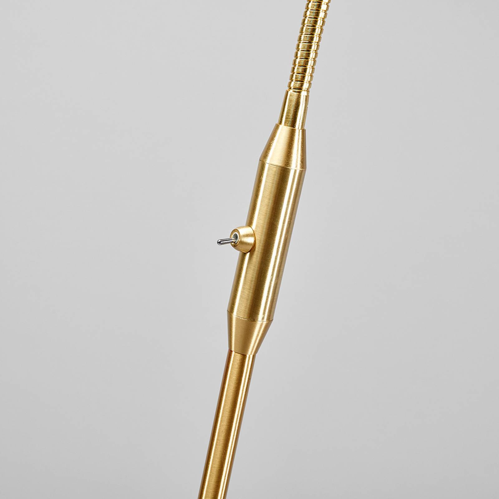 Discreta lampada da terra Elaina con superficie color ottone Questa lampada da terra è una bellissima aggiunta al soggiorno, dove può essere utilizzata in modo eccellente come illuminazione da lettura. A questo scopo, può essere posizionato accanto a un divano e acceso quando è necessaria una luce supplementare e intensa, per rilassarsi e sfogliare il proprio libro preferito. La testa della lampada in vetro bianco è compatta e progettata a forma di sfera con una piccola apertura nella parte anteriore. Due giunti flessibili - uno sotto la testa della lampada, l'altro sopra il centro del telaio - consentono un allineamento ottimale della luce. Sempre al centro del telaio, leggermente al di sotto del secondo snodo flessibile, si trova l'interruttore, che può essere azionato rapidamente anche se ci si è già messi comodi sul divano