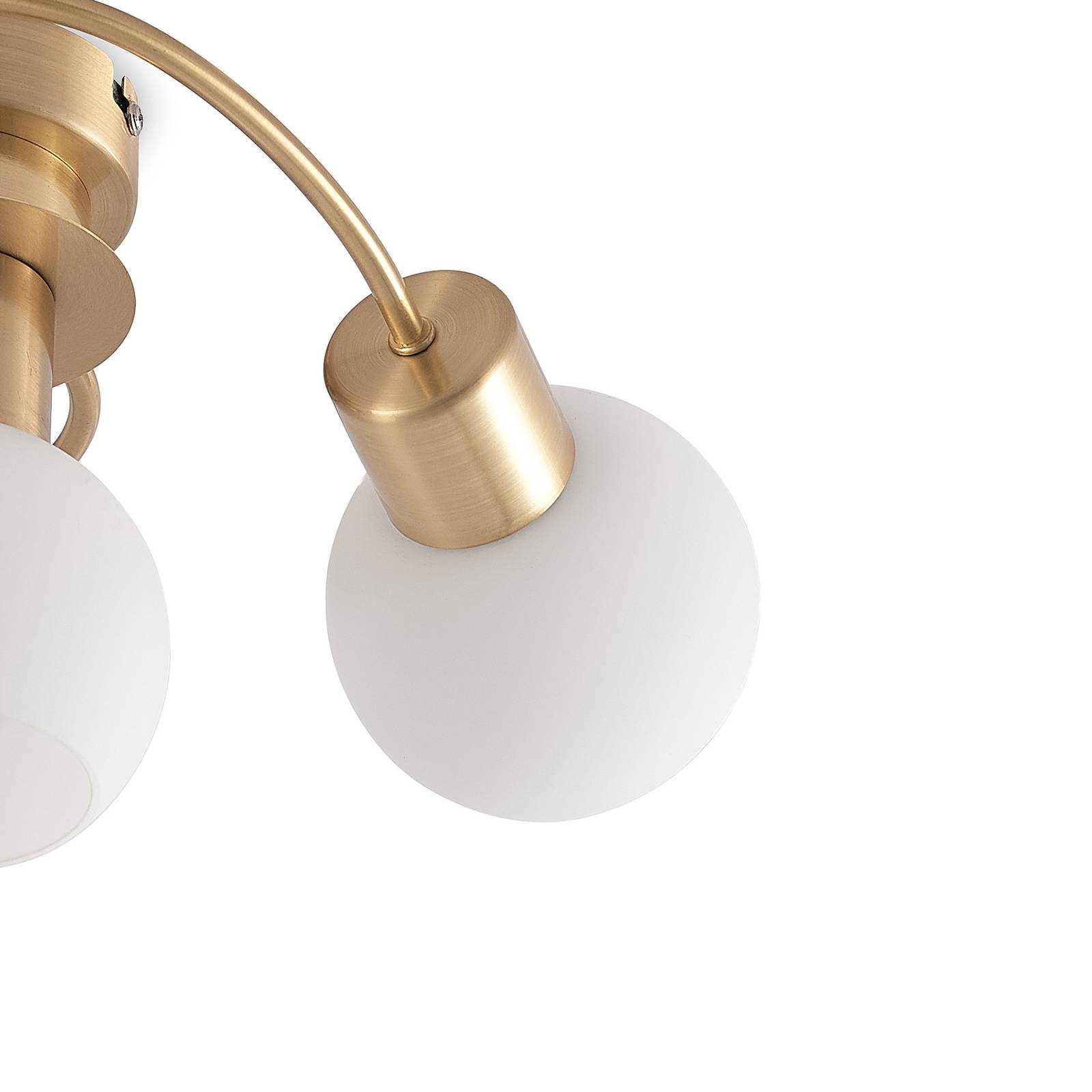Plafoniera Ciala curva con un moderno look in ottone La plafoniera Ciala è realizzata in ferro e presenta una finitura superficiale color ottone. Ha bracci curvi che le conferiscono un aspetto elegante. I tre paralumi sono in vetro bianco opalino e hanno una classica forma sferica. L'apparecchio Ciala è in grado di fornire un'illuminazione sufficiente in ambienti di piccole e medie dimensioni e ha un aspetto molto elegante sul soffitto.