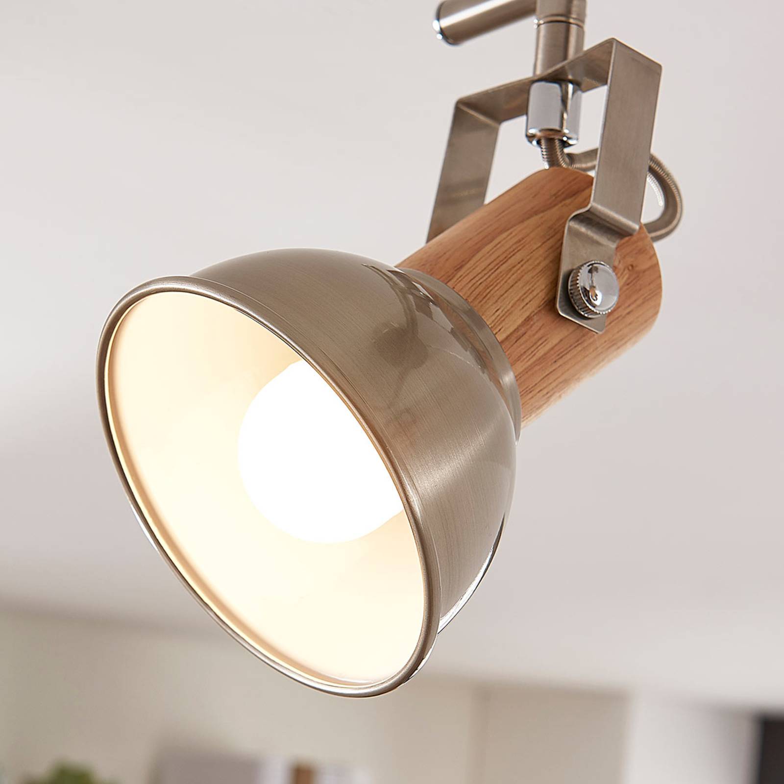 Lampada da soffitto a due luci Dennis con decoro in legno ed elementi in metalloQuesta lampada da soffitto ha due paralumi che possono essere ruotati e orientati singolarmente. Pertanto, Dennis è adatto anche al montaggio a parete. La lampada è realizzata principalmente in metallo, ma integra anche componenti decorativi in legno per un aspetto più naturale.