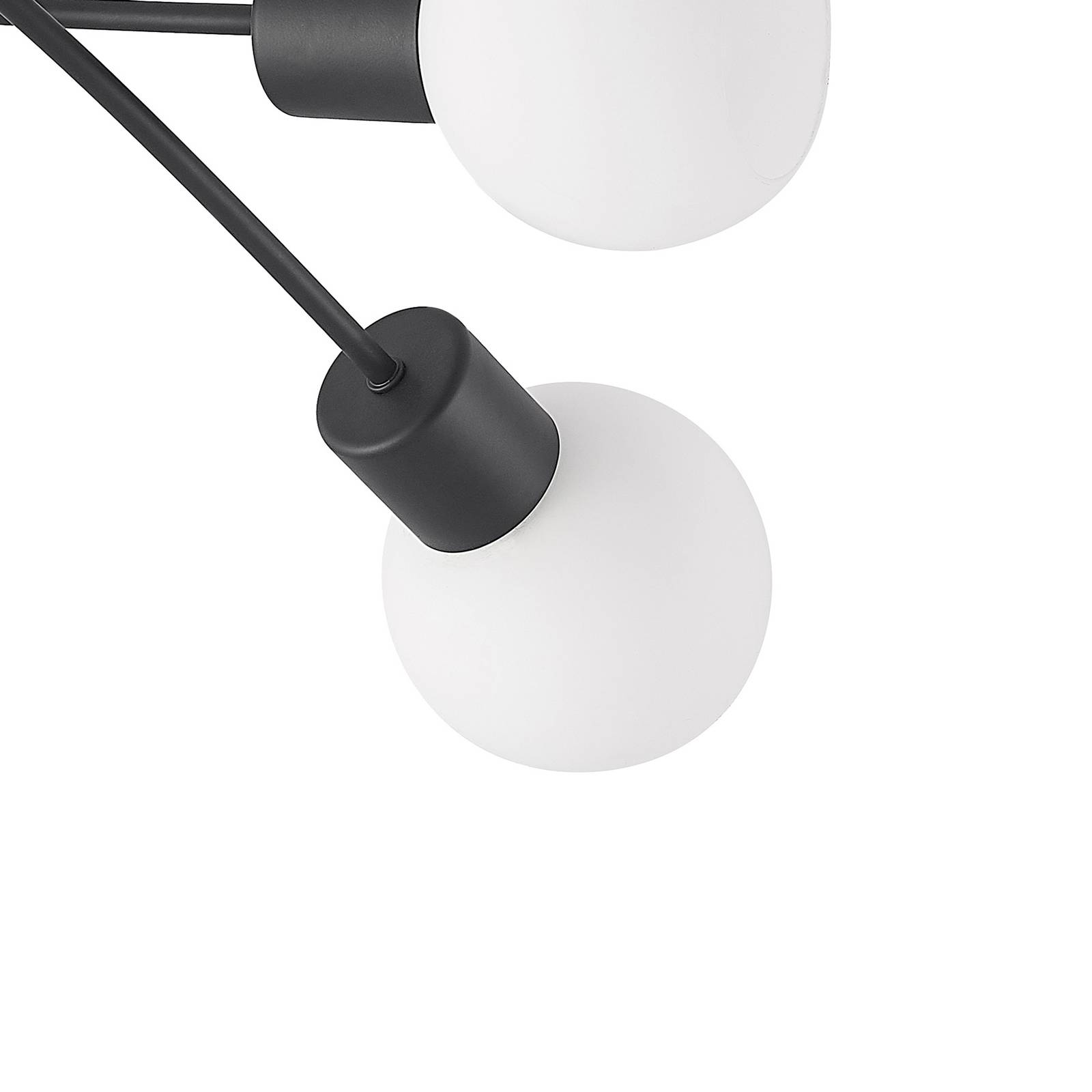 Lampada da soffitto Elaina con un bel contrasto cromatico di bianco e nero Questa lampada da soffitto si distingue per la combinazione di colori e per il design accattivante. La sua struttura è in ferro e la superficie è disegnata in un classico nero. I tre paralumi in vetro bianco opalino formano un elegante contrasto. Il concetto generale della lampada da soffitto Elaina appare coerente ed elegante. Questa sorgente luminosa si adatta bene agli interni moderni e può essere utilizzata in diversi ambienti.