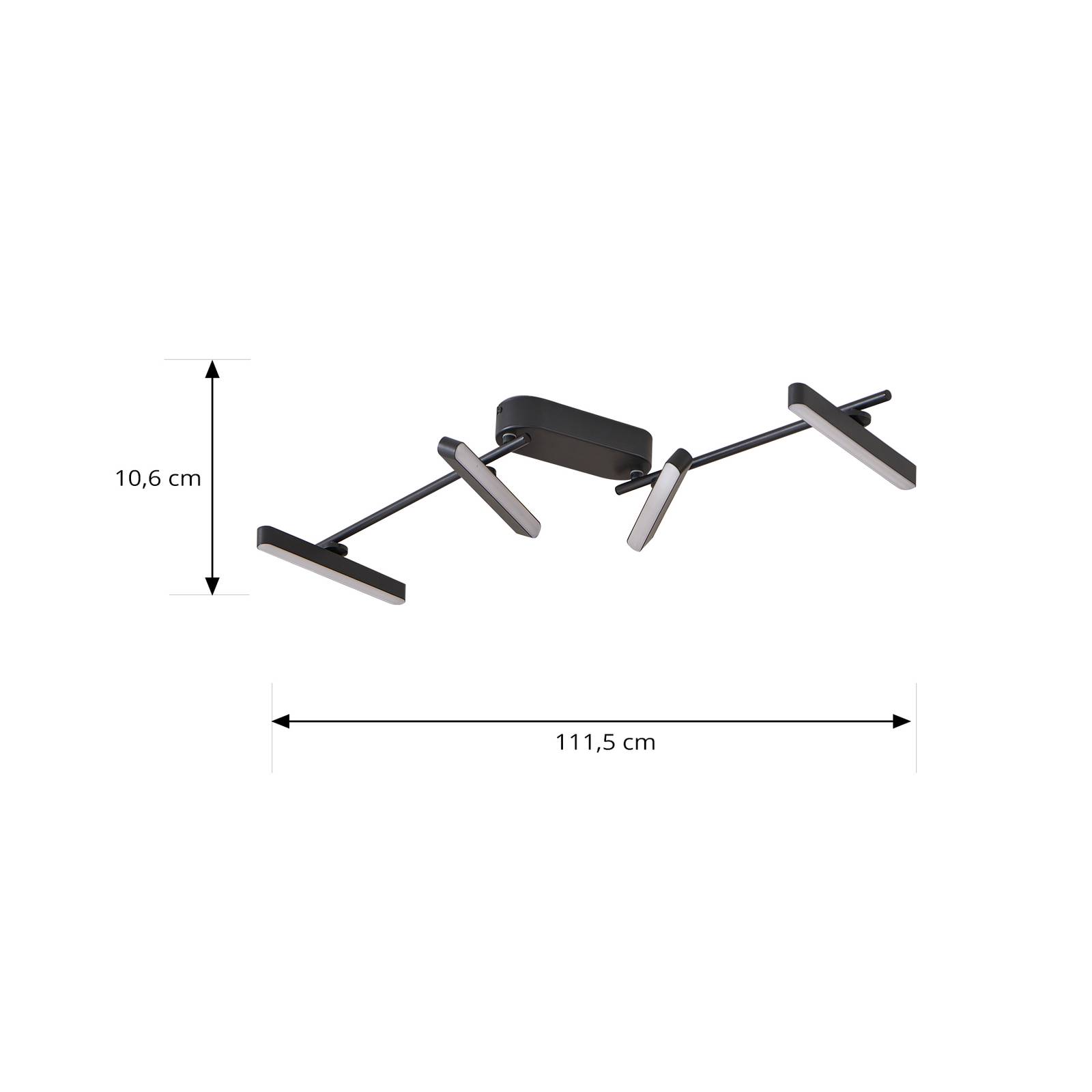 Plafoniera Eldrin LED - un compagno a 4 luci per interni dal design moderno La plafoniera Eldrin LED è a 4 luci e di colore nero. Rappresenta una soluzione di illuminazione elegante che si integra perfettamente negli interni moderni. Con la sua elegante superficie nera e le sue linee chiare, questa plafoniera non è solo un punto di forza visivo, ma garantisce anche un'illuminazione efficiente nel soggiorno, nella sala da pranzo o nel corridoio. La lampada LED integrata garantisce un'illuminazione efficiente dal punto di vista energetico che non solo inonda la stanza di una luce piacevole, ma contribuisce anche a ridurre i costi energetici a lungo termine. Anche se il dimmer non è incluso nella fornitura, la luminosità della luce può essere facilmente regolata con un dimmer esterno per creare l'atmosfera desiderata - Testa ruotabile (350°) e orientabile (90°)