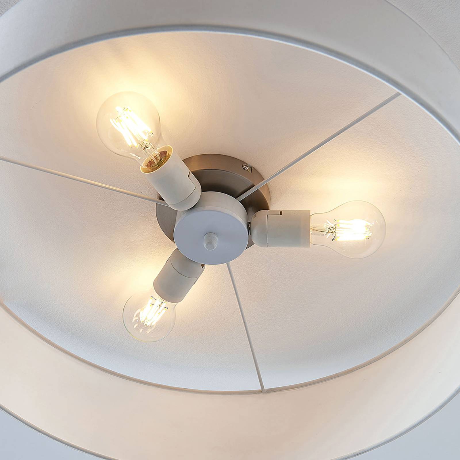 Plafoniera a LED bianca Gordana con paralume rotondo in tessutoQuesta plafoniera si adatta molto bene alla zona giorno, dove crea una luminosità adeguata con il suo design semplice ma elegante. Sia l'elemento laterale a forma di anello che il diffusore inferiore sono realizzati in tessuto bianco e forniscono una distribuzione della luce morbida e accogliente che si adatta sempre bene al soggiorno o alla zona notte. Ma anche l'uso in hotel e gastronomie è abbastanza concepibile e consente di illuminare con stile i locali. Le prese E27 consentono l'utilizzo di qualsiasi illuminante e chi pensa al basso consumo energetico dovrebbe scegliere le sempre popolari lampade LED a risparmio energetico, disponibili in molte varianti e sempre caratterizzate da una lunga durata.