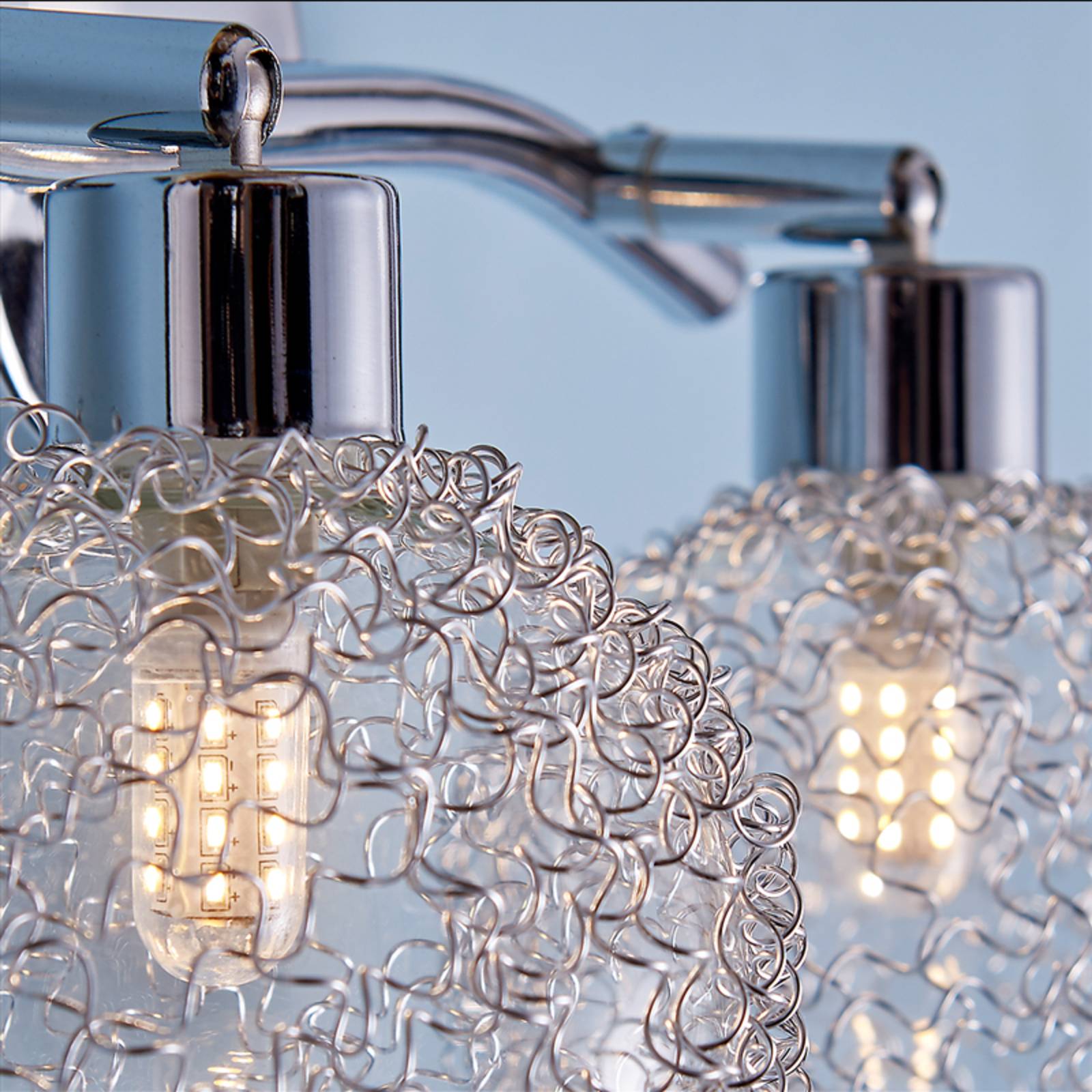 Lampada da soffitto compatta Ticino con 2 sfere in maglia metallica I paralumi in vetro chiaro e sferico della lampada da soffitto Ticino sono circondati da una maglia di sottili elementi metallici. Il risultato è che la luce è delicatamente priva di abbagliamenti e penetra nell'ambiente in modo più uniforme. Nel complesso, si crea una luce accogliente e familiare e il look speciale, con le sue caratteristiche giocose, completa in modo elegante una stanza arredata in modo moderno. Il supporto a soffitto e il resto della struttura metallica sono cromati e la leggera forma a onda dell'asta si adatta molto bene all'impressione generale di giocosità dell'apparecchio. L'apparecchio può essere dotato di sorgenti luminose G9