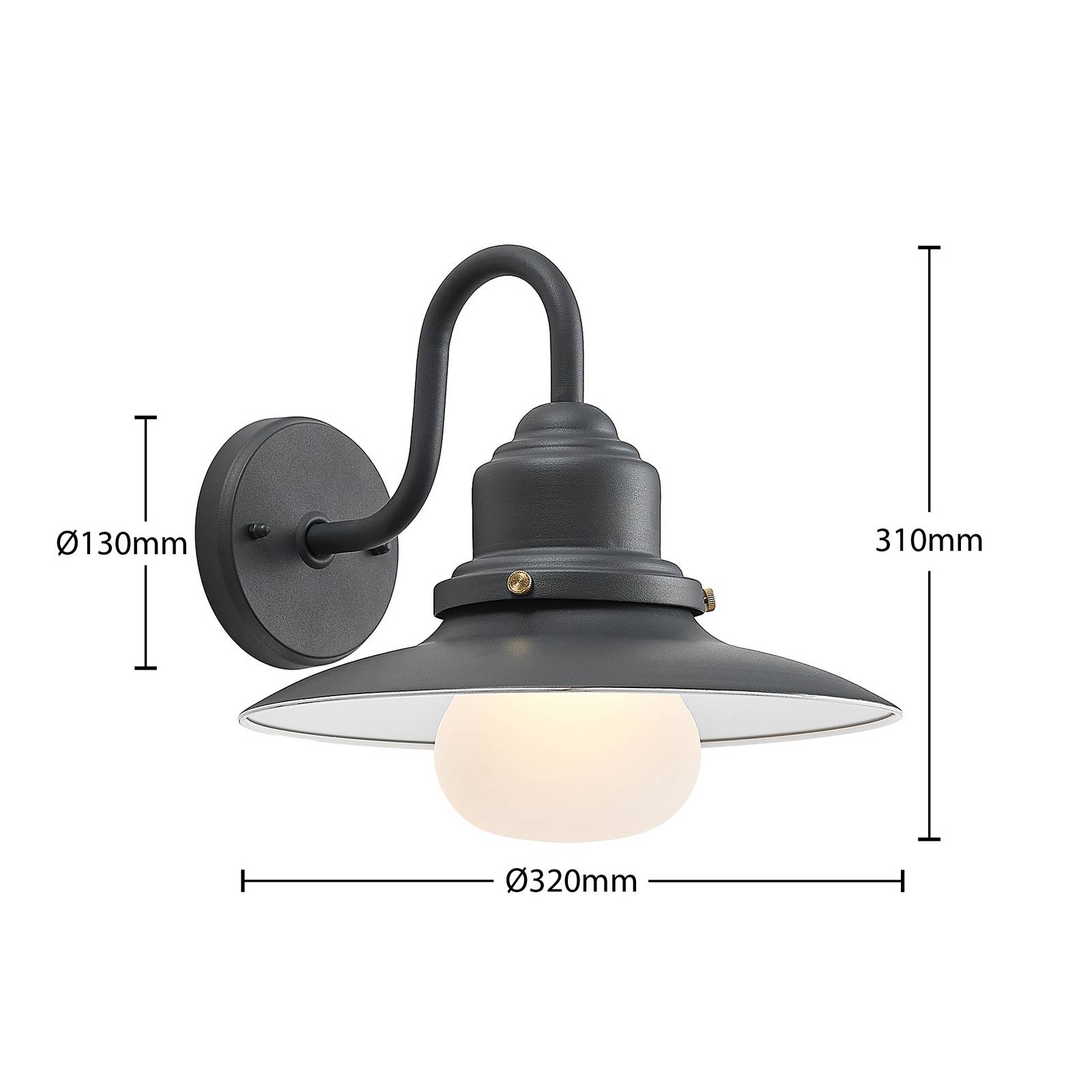 Lampada da parete per esterni Roisin in acciaio in design industriale La lampada da parete per esterni Roisin convince per il suo suggestivo aspetto in acciaio scuro. Da una staffa a soffitto si alza un sottile puntone che termina in un paralume circolare. Su questo paralume si trova un diffusore in vetro bianco nel quale può essere inserita una lampadina abbinata. La luce è suggestivamente racchiusa dal vetro bianco e la luce generata viene proiettata anche verso il basso attraverso il paralume e genera un'illuminazione priva di abbagliamento. Il design industriale della lampada da parete per esterni Roisin pone accenti suggestivi sulle pareti esterne e fa un'ottima figura sulle terrazze. Grazie al suo grado di protezione IP44, è protetto contro gli spruzzi d'acqua e per questo motivo è perfetto per un'area esterna coperta. Gli elementi rustici attirano l'attenzione e trasformano ogni parete esterna in qualcosa di molto speciale.