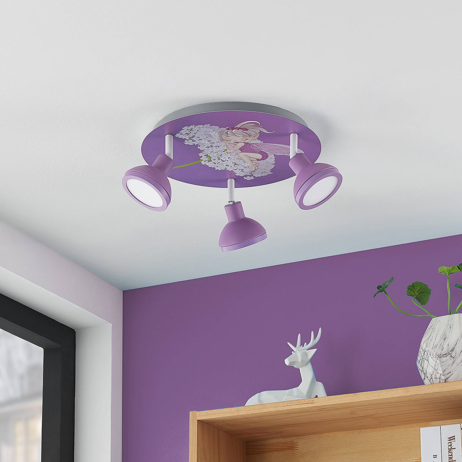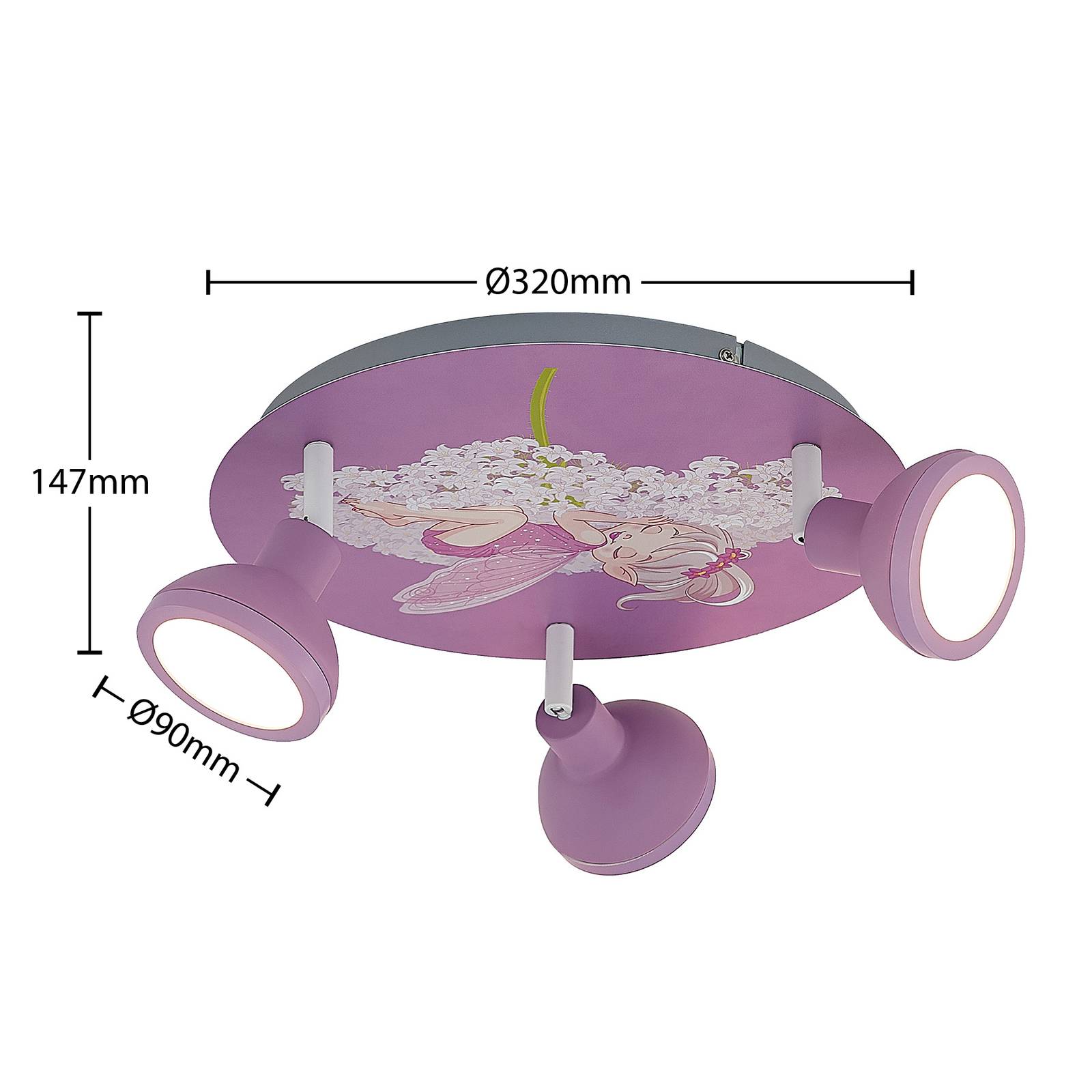 Lampada da soffitto rotonda per la camera dei bambini Roxas in ferro con immagine di fata, tecnologia stepdim La lampada da soffitto Roxas è giocosa e pratica allo stesso tempo. È rotondo, si appoggia direttamente al soffitto e ha tre faretti montati in cerchio che possono essere posizionati in diverse direzioni. Le lampadine in dotazione sono dimmerabili in termini di luminosità e possono sempre generare un'illuminazione adeguata. Tramite un interruttore a parete è possibile accendere e spegnere l'apparecchio come di consueto. Grazie alla tecnologia di dimmerazione a 3 fasi con funzione di spegnimento integrata, può essere regolata su tre diversi livelli di luminosità premendo più volte l'interruttore: 100 %, 50 % e 3 %. Il design fantasioso della plafoniera Roxas, con il suo simpatico motivo fatato, si adatta perfettamente alla stanza dei bambini e diffonde un'atmosfera allegra.