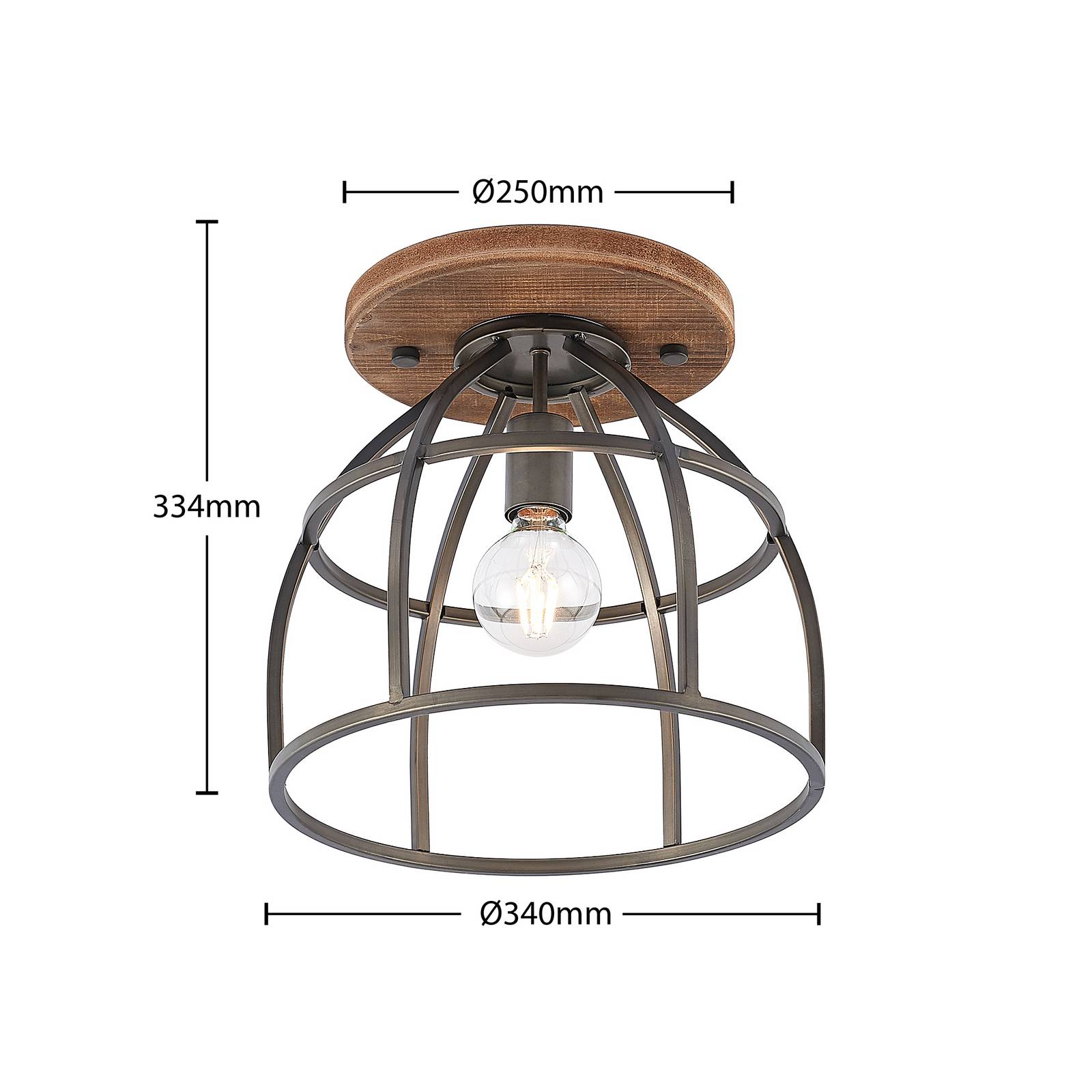 Lampada da soffitto Rutger con paralume a gabbia nero e baldacchino in legno La combinazione di un ampio paralume a gabbia realizzato con montanti in metallo nero e di un baldacchino rotondo in legno, progettato in una finitura marrone bruciata, rende la plafoniera Rutger una fonte di luce dall'aspetto rustico e dal carattere vintage, che si inserisce nei corridoi e nei salotti. La presa E27, che può essere dotata di una potenza fino a 60 W, si trova al centro dell'ombra aperta. Con una lampadina decorativa a incandescenza a LED, possibilmente con vetro colorato (non inclusa), il design della lampada è completato. Il design aperto consente una radiazione diretta della luce a tutto tondo.