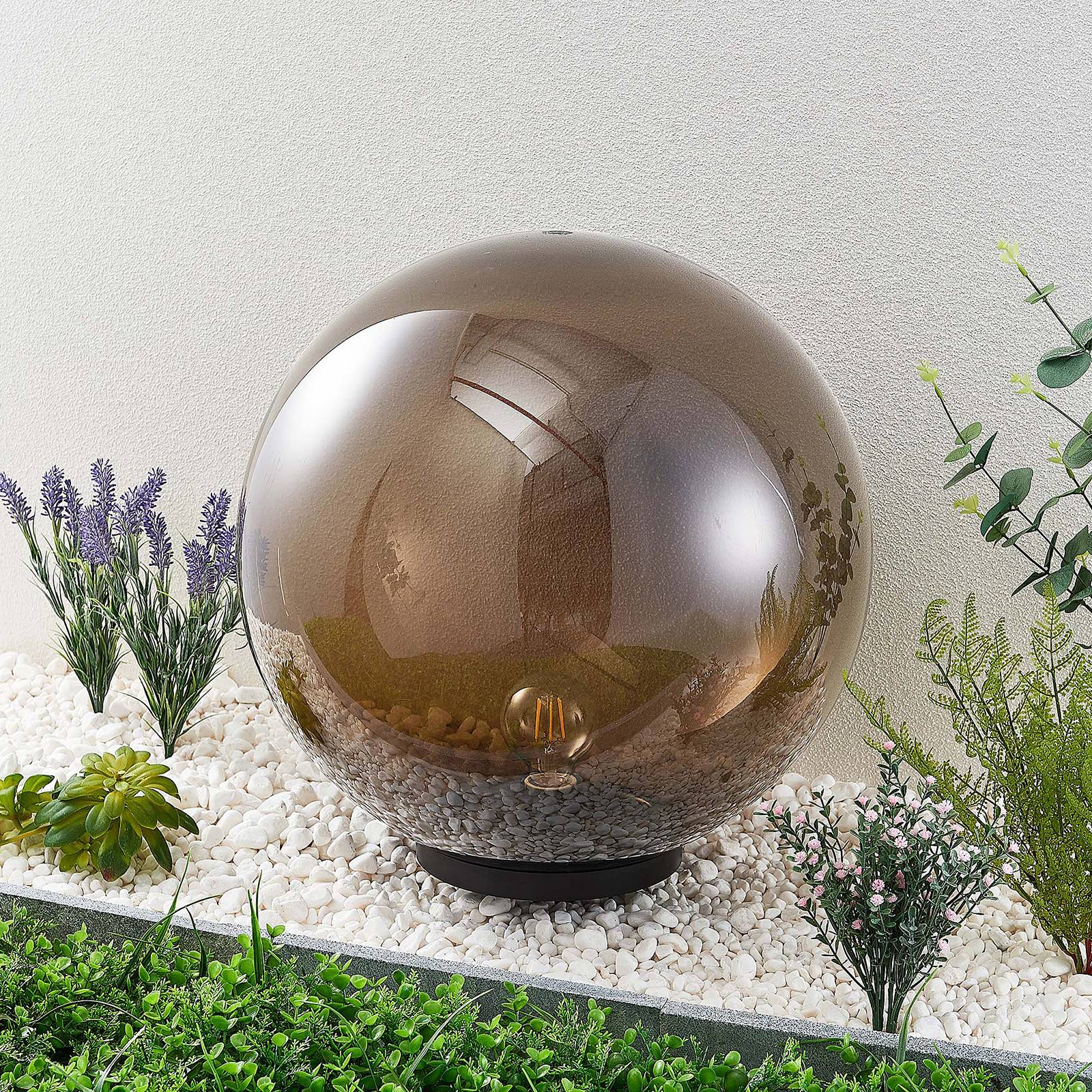 Lampada sferica decorativa Samini in ottica grigio fumo, con pratico picchetto La lampada sferica decorativa Samini ha un aspetto scuro e un design sofisticato. È costituita da una piccola base rotonda su cui poggia un opulento paralume sferico. Il paralume è di plastica semitrasparente in grigio fumo, una finitura che lascia intravedere la sorgente luminosa. Per questo vale la pena sceglierne una decorativa. Le lampadine che più si prestano a valorizzare l'aspetto d'insieme sono soprattutto quelle a filamenti oppure quelle rustiche. Grazie al suo grado di protezione, Samini non teme le condizioni meteorologiche. La fornitura comprende un pratico picchetto con cui si può collocare la lampada in giardino o in terrazza spostandola ogni volta che si vuole.