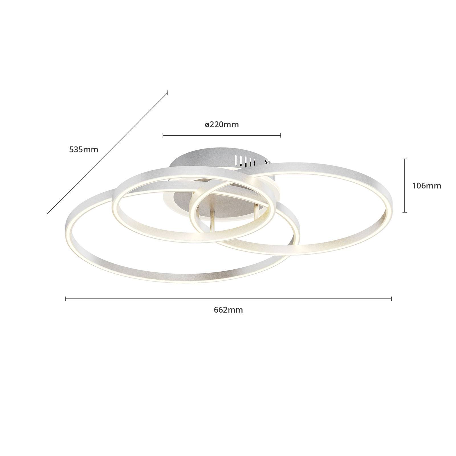 Moderna plafoniera LED Tula con telecomando, app e gioco di colori CCT Cerchi di diverse dimensioni costituiscono l'elemento base della moderna plafoniera LED Tula. Sia che si tratti di luce bianca calda di sera o di luce bianca fredda diurna per lavorare con concentrazione, l'atmosfera dell'apparecchio Tula può essere comodamente modificata con il telecomando in dotazione. È inoltre possibile dimmerare in modo infinito, accendere e spegnere la lampada e creare una pratica luce notturna. Per una maggiore funzionalità, l'apparecchio può essere controllato con l'app Tuya Smart abbinata. Questa è disponibile gratuitamente e deve solo essere collegata al Wi-Fi di casa. Dati tecnici / compatibilità: - Può essere controllato tramite l'app gratuita Tuya Smart (disponibile per iOS e Android) e con il Wi-Fi di casa - Può essere controllato anche senza Wi-Fi e internet tramite il telecomando in dotazione - Colore di luce regolabile da bianco caldo (3.000 K) a luce diurna (6.000 K) - Può essere dimmerabile solo tramite l'app o il telecomando in dotazione