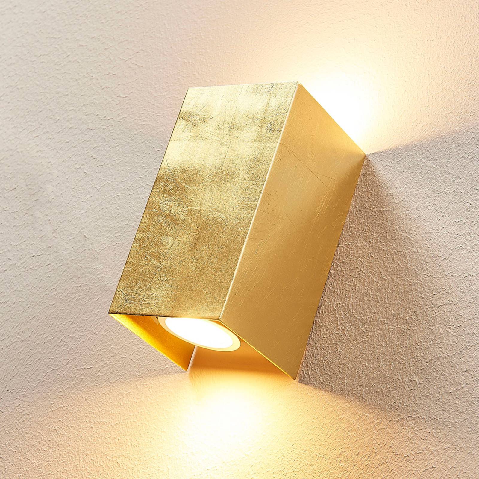 Lampada da parete Tabita a due luci con superficie color oro opaco Tabita è un elemento d'arredo elegante, con la sua superficie color oro opaco e la sua luce indiretta. Per queste sue caratteristiche, Tabita è perfetta per un ambiente in cui si desidera creare un'atmosfera calda e accogliente. Le lampadine, tutte compatibili purché con attacco GU10, sono applicate sul lato superiore e inferiore della lampada quadrata color oro. Quando la si accende, Tabita diffonde tutta la sua luce verso l'alto e verso il basso, con un effetto molto gradevole. La lampada da parete Tabita dimostra che modernità, calore ed eleganza non sono incompatibili, ma possono coesistere in perfetta armonia. A prescindere dalla stanza in cui si desidera installare la lampada, nell'ingresso o in camera da letto, la combinazione di calore ed eleganza è sempre apprezzata.