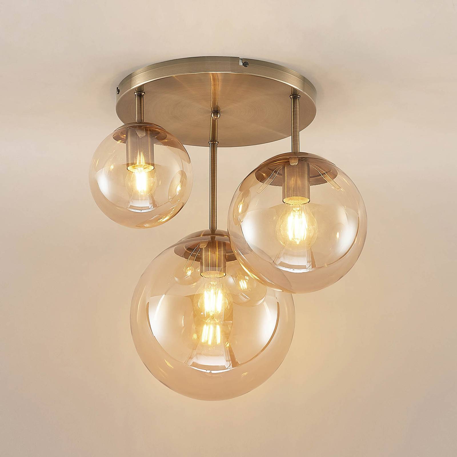 Plafoniera a tre luci Teeja con attacco rotondo in ottone antico e paralumi in vetro ambrato L'apparecchio a soffitto ha una nobile finitura in ottone antico, mentre i paralumi in vetro sono a forma di sfera di colore ambrato e possono quindi produrre una luce dai toni particolarmente caldi. Tuttavia, la superficie è fondamentalmente chiara, in modo che le lampadine siano ancora ben visibili, sia quando la lampada è accesa che quando è spenta. Per questo è consigliabile scegliere sorgenti luminose particolarmente decorative, come nel caso delle lampade a filamento o rustiche, che di solito sono anche dotate di tecnologia LED a risparmio energetico. I paralumi rotondi, che assomigliano a sfere, sono di dimensioni diverse e pendono dal pannello del soffitto a diverse altezze. Il risultato è un aspetto individuale e un po' più dinamico. L'apparecchio fa bella figura ovunque nel soggiorno e si adatta sempre bene all'illuminazione dei corridoi.