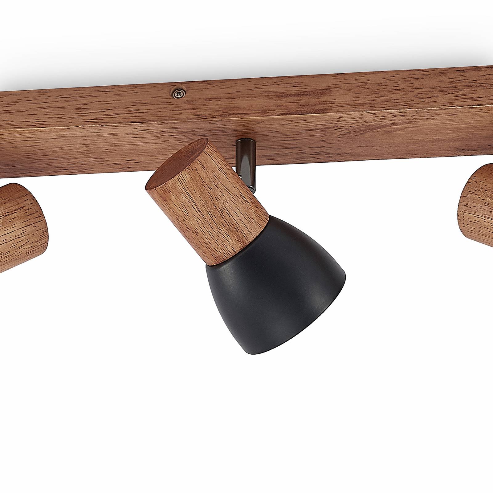 Tonja - Faretto da soffitto classico in veste moderna Gli spot da soffitto come Tonja sono un ottimo modo per illuminare una stanza. Con le teste luminose regolabili individualmente, è possibile creare condizioni di illuminazione ottimali per diverse aree. Se equipaggiate le prese E14 con lampade LED (vedi accessori), otterrete anche un eccellente risultato di efficienza energetica. Il design semplice può essere inserito molto bene in interni classici e anche moderni. Il legno dà alla lampada un aspetto accogliente, mentre i paralumi in metallo nero la ravvivano un po'.