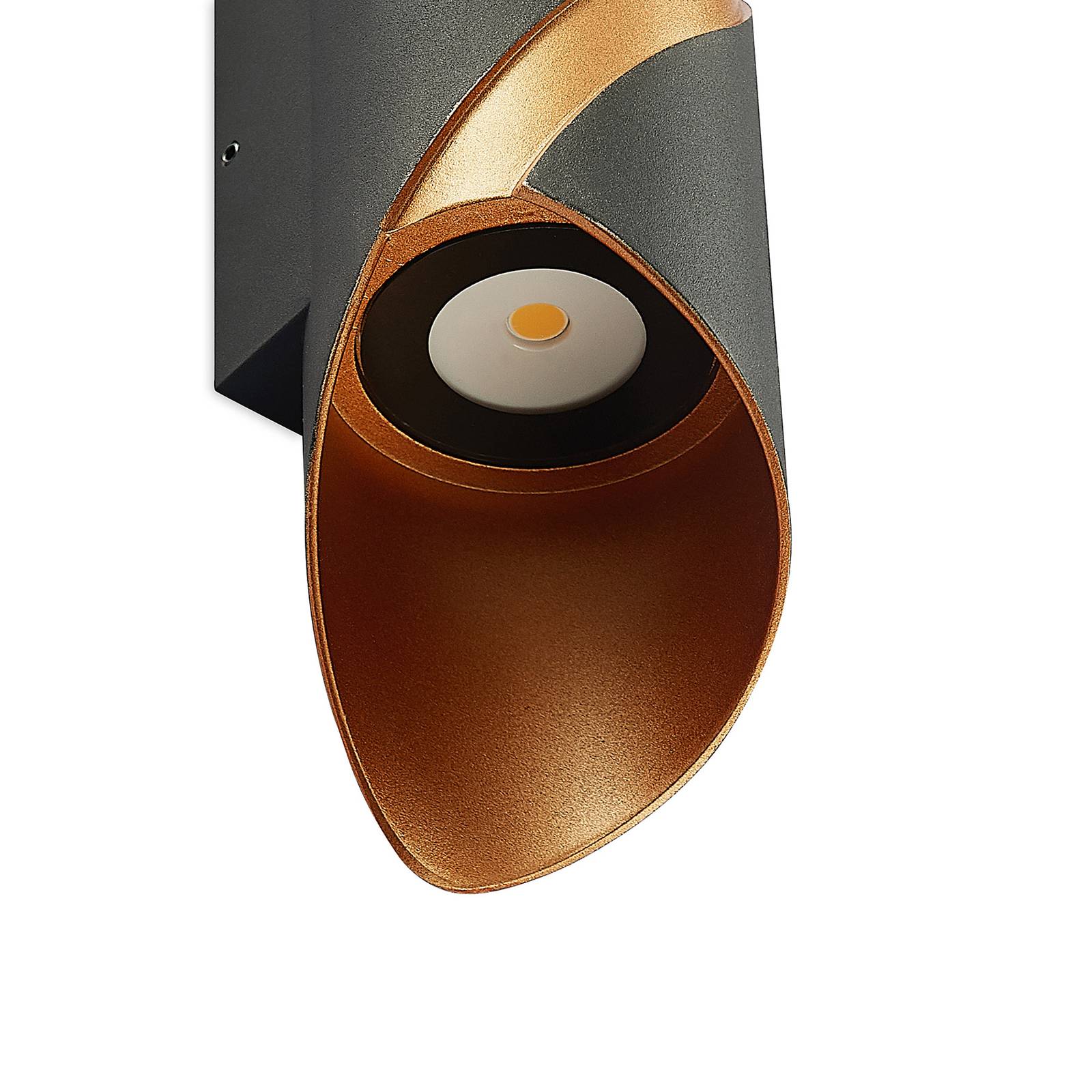 Elegante lampada da parete a LED Ulini in nero-oro Questa bella lampada da parete a LED si presenta con un design insolito e una combinazione di colori di successo. Il paralume della lampada Ulini è stato realizzato in alluminio e progettato in un classico nero all'esterno. L'interno, d'altra parte, ha una calda finitura dorata, che valorizza la lampada e allo stesso tempo fornisce accenti di luce calda. All'interno, sono installati due moduli LED che forniscono una luce bianca calda verso l'alto e verso il basso. Questo crea un'illuminazione indiretta che appare calda e accogliente. Questo apparecchio d'illuminazione entra in scena soprattutto negli interni moderni.