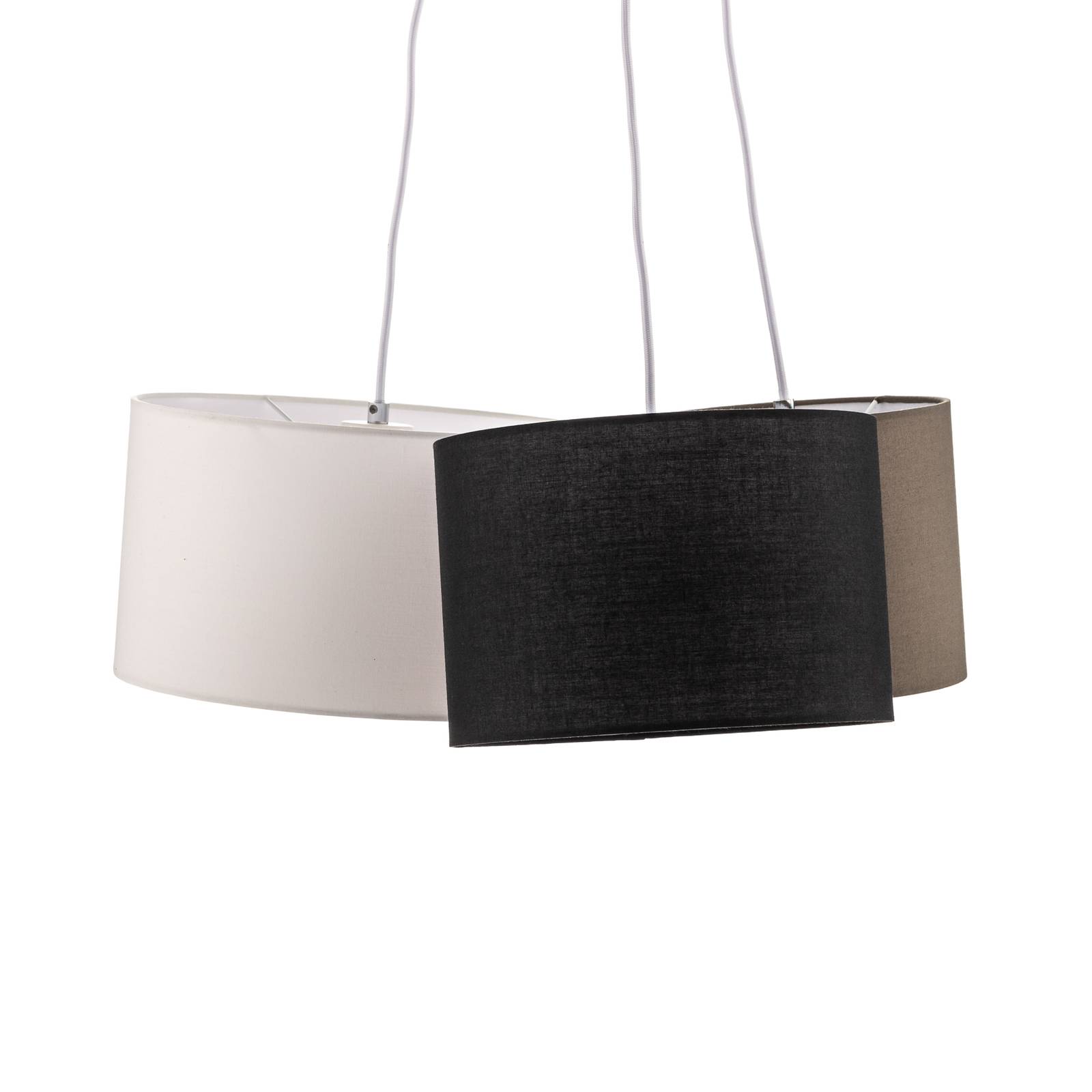 Lampada a sospensione Vironi in bianco e nero con paralumi a sospensione in tessuto La lampada a sospensione Vironi cattura immediatamente l'attenzione con il suo design individuale ed elegante. I tre paralumi sono realizzati in tessuto e hanno una classica forma cilindrica. Sono appesi a fascio al soffitto ed emettono la luce lateralmente senza abbagliare l'ambiente circostante. Il contrasto cromatico tra bianco e nero ha un effetto molto elegante, rendendo questo apparecchio un richiamo visivo anche quando è spento.