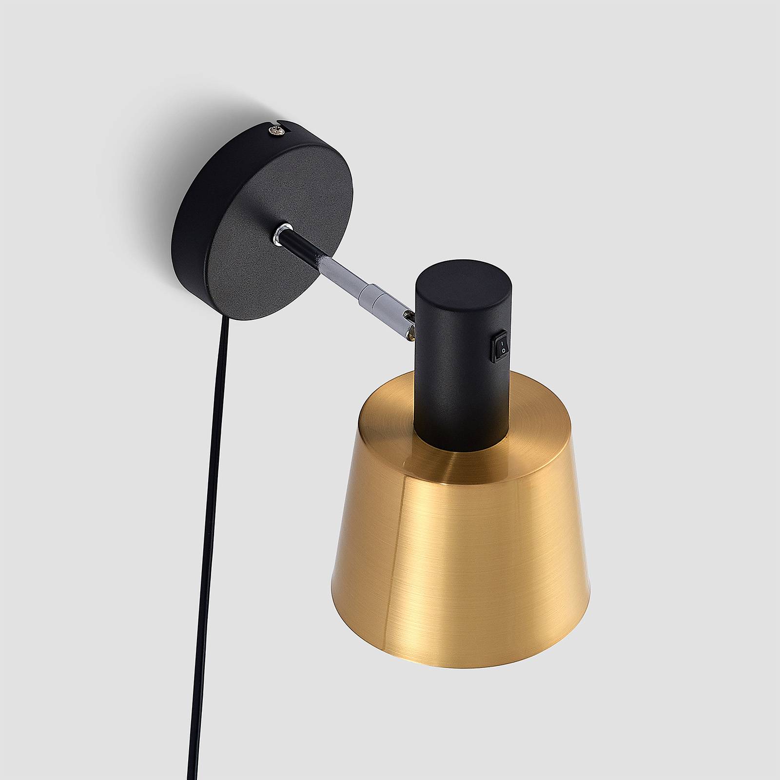 Compatta applique Vlada in nero e ottone, con interruttore a levetta, cavo e spina Il linguaggio formale semplice e ridotto dell'applique Vlada si intona bene a un arredamento di gusto scandinavo, caratterizzato dal purismo e dall'effetto accogliente. La struttura è di colore nero. Forma un armonioso contrasto il compatto paralume metallico che luccica in un elegante color ottone. Quest'applique è ideale per accompagnare la lettura. Viene fornita con cavo e spina che basta semplicemente collegare a una presa. L'interruttore si trova sopra il paralume, sull'elemento cilindrico nero.