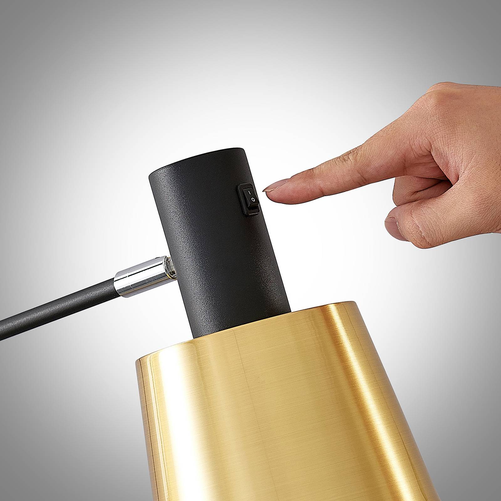 Elegante lampada da terra Vlada con paralume color ottone Vlada è una lampada da terra di stile purista e di design, molto intonata a un arredamento di gusto scandinavo. Lo stelo metallico nero è molto sottile e inclinato in alto, in basso invece la lampada poggia su un piedistallo rotondo. Forma un armonioso contrasto il compatto paralume metallico che luccica in un elegante color ottone. Per il funzionamento si utilizza una lampadina ad attacco E27, preferibilmente in ottica a filamenti che valorizza l'aspetto d'insieme. Vlada è una lampada da terra che si presta bene all'illuminazione di sfondo in salotto ed è validissima anche per leggere.