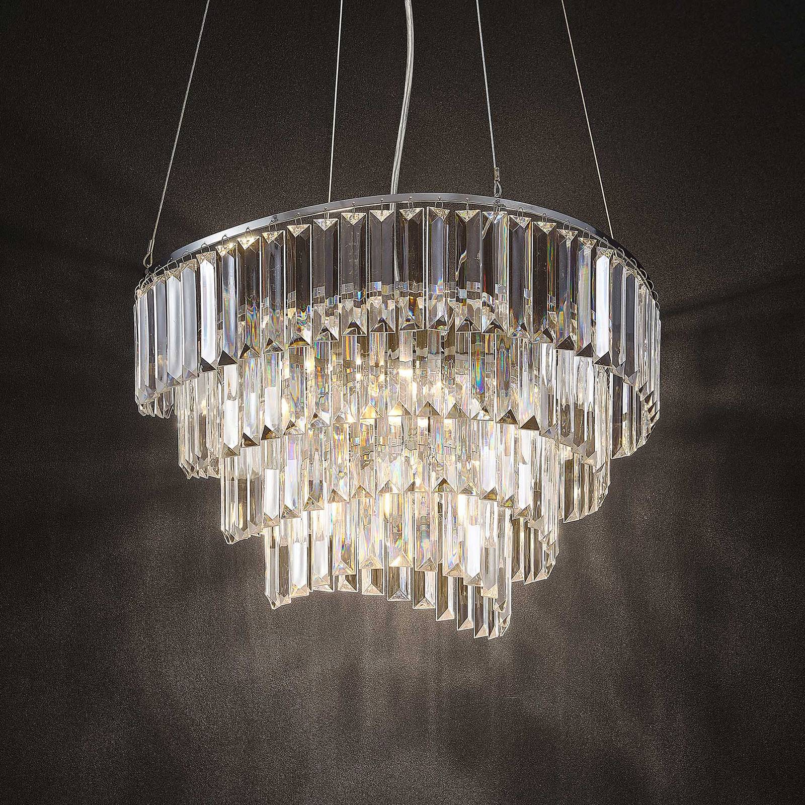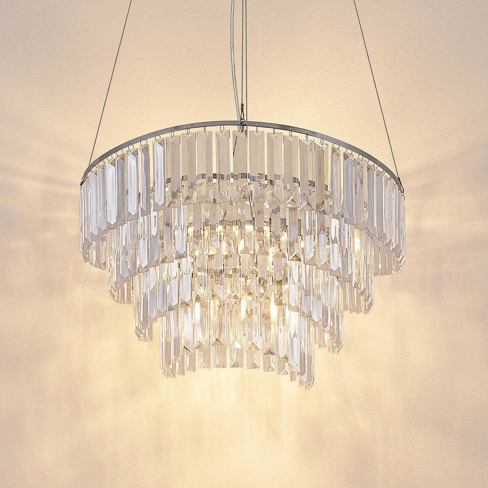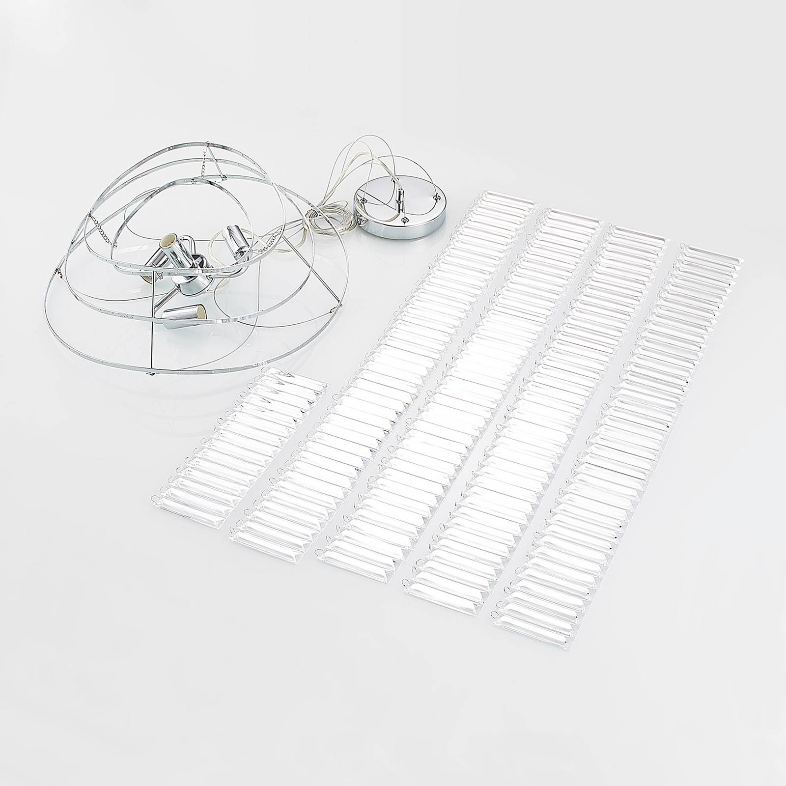 Lampada a sospensione Volina in cromo crea effetti di luce speciali La lampada a sospensione Volina brilla in un moderno cromo e crea bellissimi accenti di luce nella stanza. In primo piano il paralume sporgente, che si staglia come un elegante lampadario. Si compone di molti piccoli elementi trasparenti, che sono attaccati in quattro strati uno sopra l'altro e forniscono una bella scintilla. Se si utilizzano lampade E14 dimmerabili e se è già disponibile un dimmer standard da parete, la luminosità della lampada può essere regolata in pochissimo tempo in base alle proprie esigenze. Il look glamour di Volina non solo valorizza il proprio salotto, ma può essere utilizzato anche nel settore della ristorazione o alberghiero.