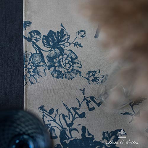 LINEN & COTTON Runner da Tavola Impermeabile Fiore in Misto Tessuto Motivo Floreale - 59% Lino, 41% Cotone, Blu Beige (34 x 200 cm) Runner Antimacchia Facile da Pulire per Casa Cucina Esterno Outdoor