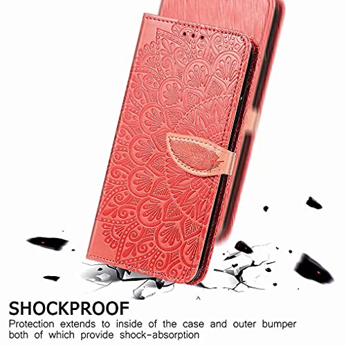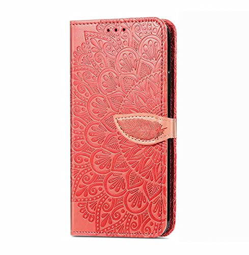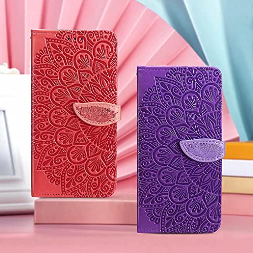 LINER Pelle Cover per OnePlus Nord 2 5G, Elegante Motivo a Fiore Mandala Design Flip Custodia in PU Premium Portafoglio, Sottile Antiurto Case Cover con Chiusura Magnetica Piuma - Rosso
