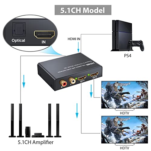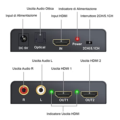 LiNKFOR HDMI Audio Estrattore 2 Uscite 4K 3D con Alimentatore HDMI a SPDIF Toslink Ottico + 2 Uscite Video HDMI Splitter HD Digitale a Stereo Analogico R/L 2CH/5.1CH per Blu-ray DVD SKY Box PS3 PS4
