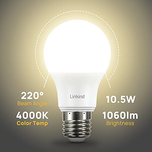 Linkind Dimmerabile Lampadina LED E27, 10,5W(Equivalenti a 75W), Lampadine A60 Edison 1060 Lumen, Luce Naturale 4000K, Angolo del Fascio di 220 Gradi, AC220-240V, Pacco da 6