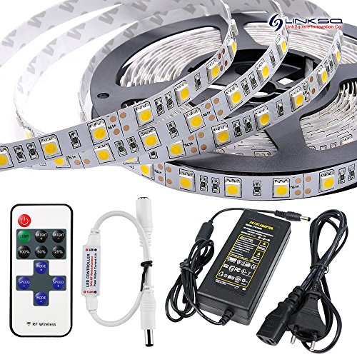LinkSquare 5m Pacchetto Completo 5050 IP20 (60 LED/m) Striscia di LED Illuminazione con 11 Tasti RF Telecomando e Mini Controllore + Alimentazione Trasformatore (Bianco Caldo 3000K-35000K)