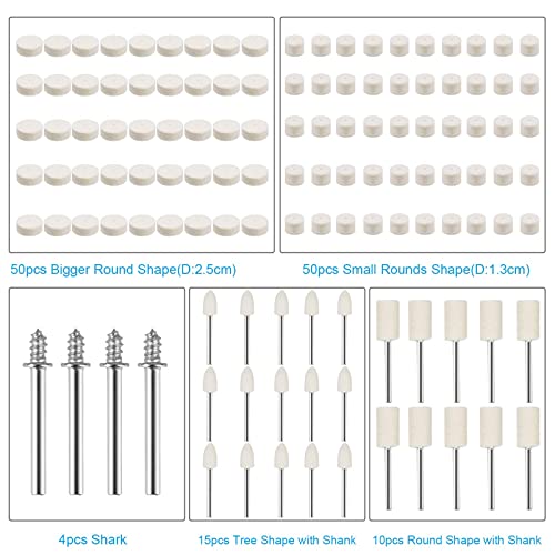 MULTI SOSTITUZIONI: set di mole in lana per lucidare comprende 129 pezzi, 50x di forma rotonda più grande (D: 2,5 cm), 50x di forma piccola rotonda (D: 1,3 cm), 4x squalo, 15x forma di albero con gambo, 10x forma rotonda con gambo, facile da sostituire e riutilizzabile.