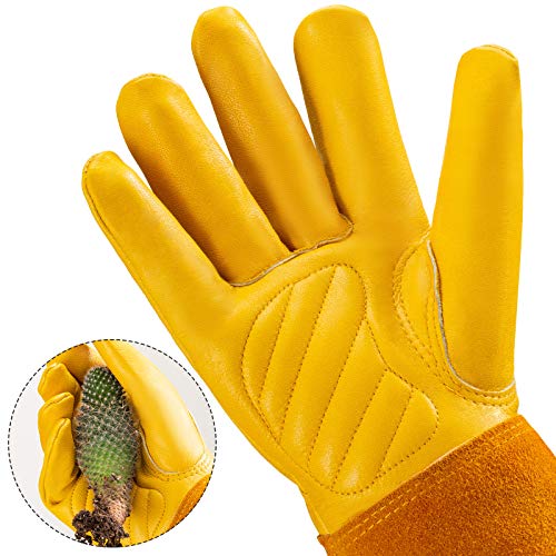 MATERIALE DI LUSSO : Le parti delle mani di questi guanti da giardinaggio a prova di spine sono realizzate in pelle pieno fiore. Combina l'aspetto naturale della pelle grezza con un'eccellente durata e una facile manutenzione. Le maniche lunghe sono realizzate in spessa pelle crosta, può proteggere l'avambraccio dai graffi