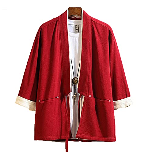 Linnhorr Giacca Kimono da Uomo a Doppio Colletto Cappotto Sottile in Cotone e Lino Primavera Estate Giappone Red XXXL