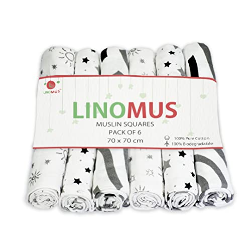 Linomus Panni in mussola per neonati, 70 x 70 cm, morbidi, assorbenti e traspiranti, 100% puro cotone, ideali per pulire, pulire e coprire i neonati, tema galassia, colore: nero e grigio