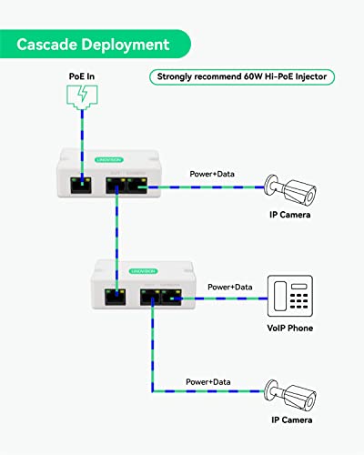 【FINO A 1.000 FT POE + ESTENSIONE DATI】 La trasmissione di dati POE + 330 piedi extra verrà estesa con un amplificatore POE Linovision. E supporta la distribuzione in cascata a due livelli, quindi viene fornita una trasmissione dati POE totale di 1.000 piedi +. (L'ingresso POE del 2° POE Extender deve essere collegato alla porta Out del 1° POE Extender, non alla porta della fotocamera)
