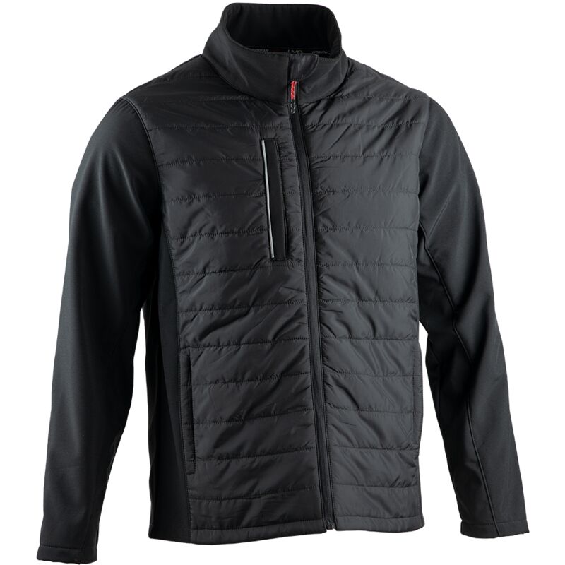 Dettagli: Collo alto per un maggiore comfort Maniche lunghe in softshell a 2 strati Corpo in piumino trapuntato a righe in microfibra Chiusura centrale con zip e patta per la protezione del mento 1 tasca verticale sul petto bordata con profili riflettenti argento 2 tasche inferiori con zip Tessuto elasticizzato per facilitare i movimenti Caratteristiche: Softshell: 94% poliestere, 6% elastan, 310 g/m². Piumino: 100% poliestere, 300 g/m². Nero
