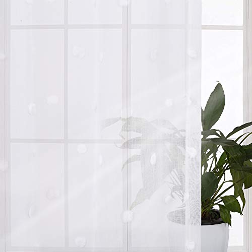 LinTimes Tende trasparenti per cameretta dei bambini, in voile jacquard, con motivo a pompon, in finto lino, con occhielli in tinta unita, 150 x 150 cm, 2 pannelli