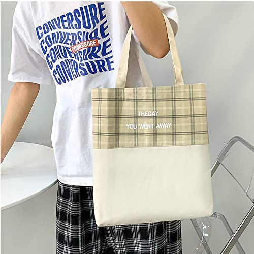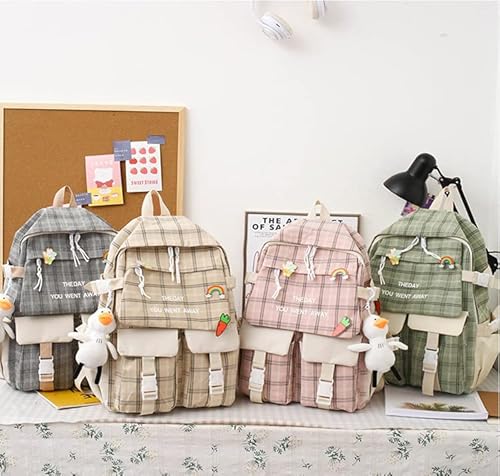 Lioncool 5 Pcs Korean backpack for teens, plaid backpack with lunch box-kawaii backpack with a cute plush animal, checkered backpack for School (Khaki)