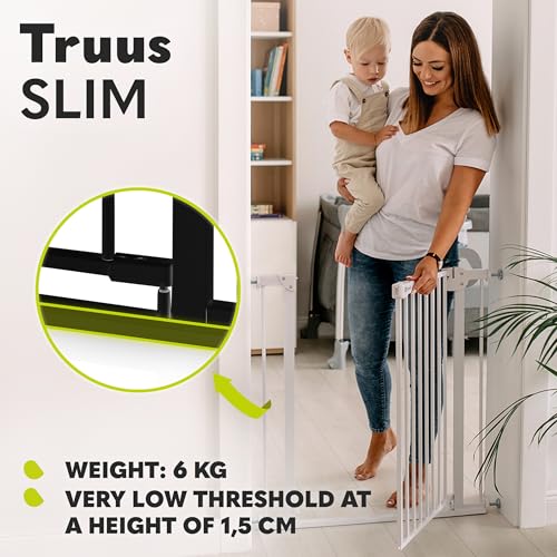PASSAGGIO SICURO. Per la sicurezza dei bambini, la barriera Truus Slim non presenta spigoli vivi. Questo elimina completamente il rischio di possibili lesioni. Per eliminare il rischio di inciampi, la soglia arrotondata appositamente progettata è alta solo 1,5 cm. Inoltre, la soglia ha uno spazio separato per la striscia del pavimento in modo che il cancello sia sempre perfettamente adattato al suolo.