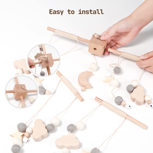Facile da appendere: campanello per culla sono facili da assemblare, basta inserire i bastoncini di legno nelle posizioni corrispondenti e la parte superiore è dotata di un cordino facile da appendere, che può essere facilmente fissato sopra il lettino o in altre posizioni adatte.