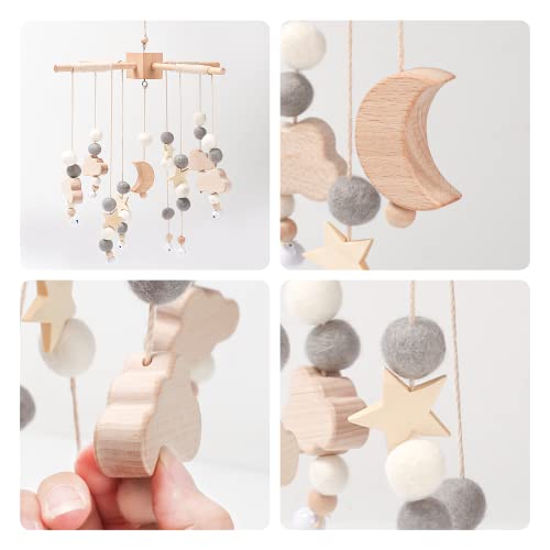 LIPJISL Baby Campanelli Eolici Giostrina Culla Neonato Legno Baby Campanelli Eolici con Palline in Feltro Campanello per Culla per Decorazione Culla e Cameretta Grigio