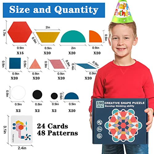 【Blocchi di legno】: 180 x puzzle di forme geometriche, 24 x schede di disegno, 1 x sacchetto di conservazione. Cuciture a forme multiple per coltivare la cognizione geometrica dei bambini e il gioco avanzato mutevole per soddisfare le esigenze di crescita dei bambini.