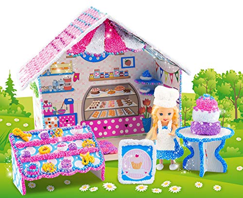 Pasticceria 3D da montare, tavolino e bancone da montare, pasta colorata, perle magiche, colla, bambola Isa, istruzioni