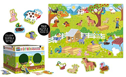 Contiene grande puzzle della fattoria, animali sagomati, maxi scatola tattile e istruzioni