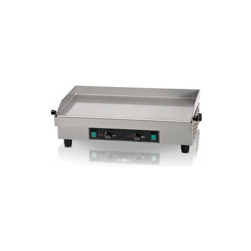 Codice RS7846 - Fry top elettrico da banco con piastra liscia, modello ME-GECII2, dimensioni cm. 70x38x21.5 (lxpxh), dimensioni piano cottura cm. 64x34, 230 volt, 2x1.8 kw, temperatura di lavoro 50-300°C. Macchina elettrica per cottura a secco o ad olio. Struttura in acciaio inox e piano di cottura in acciaio. Accensioni e termostati di regolazione separati.