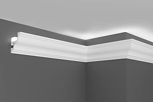 Profilo in stucco LED KH905 da 2 metri (1 listello), dimensioni: 45 x 40 mm, colore: bianco, materiale: polistirene ad alta densità, densità circa 400 kg/m³. Nastro in alluminio non incluso