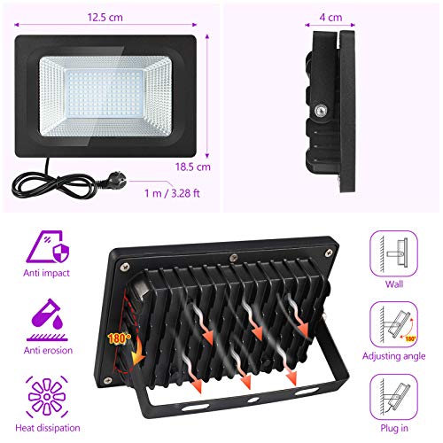 ► Luce UVA Impermeabile e sicura IP66: lunghezza d'onda: 385-400 nm, sicura per gli occhi e la pelle umani. IP66 impermeabile, adatto per uso interno ed esterno. Adatto per Natale, Halloween, club, feste, acquari, gruppi musicali, spettacoli teatrali, ecc.