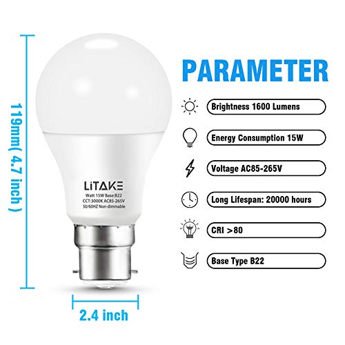 Litake - Lampadine a LED B22, equivalenti a 150 W, 15 W, A60, super luminose, 1600 lm, a risparmio energetico, satinato, non dimmerabile, confezione da 6 pezzi (bianco caldo 2700 K)